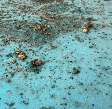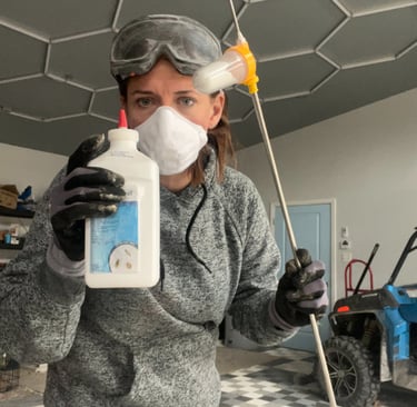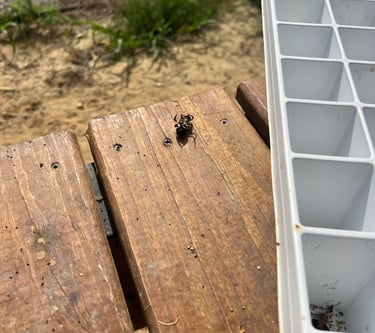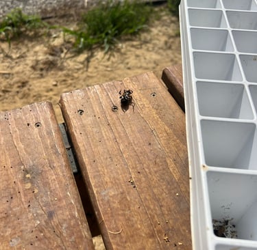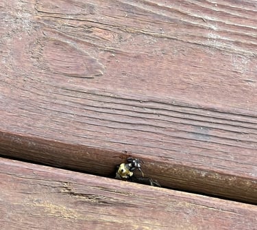 Timing – Evening Ambush: I waited for the right evening to launch my counterattack. Carpenter bees are most docile at night, ideally just after sunset when they’ve retreated into their tunnels for the evening. Treating the holes at dusk significantly increases your odds of hitting all the bees while they’re “at home,” and it also minimizes the chance of getting buzzed by aggressive males guarding the entry. So, one calm evening, I suited up: long sleeves, gloves, safety goggles, and an N95 mask (you don’t want a face full of insecticidal powder). Armed with a ladder and a puffer duster (the kind used for diatomaceous earth or pest control dusts - also linked below*), I went hole to hole around the house.