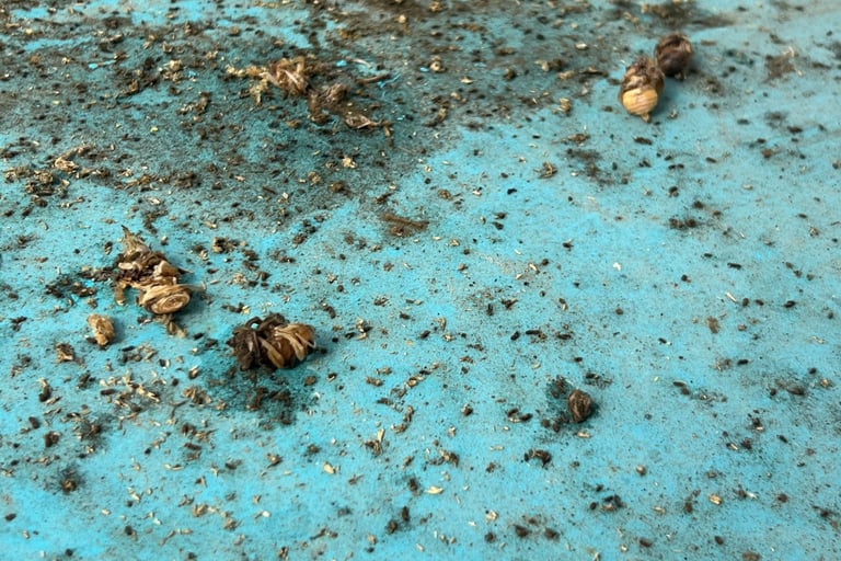 A few days after dusting, I returned to each hole with a wire hanger that I had unwound into a long, flexible rod. I carefully inserted it into each tunnel, probing and scraping the sides. This coat hanger trick let me break up the bees’ internal walls (the pollen plugs and mud partitions) and stir the dust deeper into the nest. Pest control pros recommend doing this kind of tunnel cleaning to ensure the insecticide reaches all the brood cells. It also helps clear out any debris. In my case, it did something else too – it brought out visible proof of the carnage. As I twisted the wire inside one particularly deep tunnel, I felt it hit and break through those internal chambers. When I pulled the hanger out, along with it came a grotesque mix of pulverized wood, pollen clumps, and dead carpenter bee larvae. A few larger bee bodies fell out as well. It was not a pleasant sight, but it was evidence that my two-step approach had worked. The adult bees had succumbed to the dust, and their offspring were not going to survive to continue the cycle.