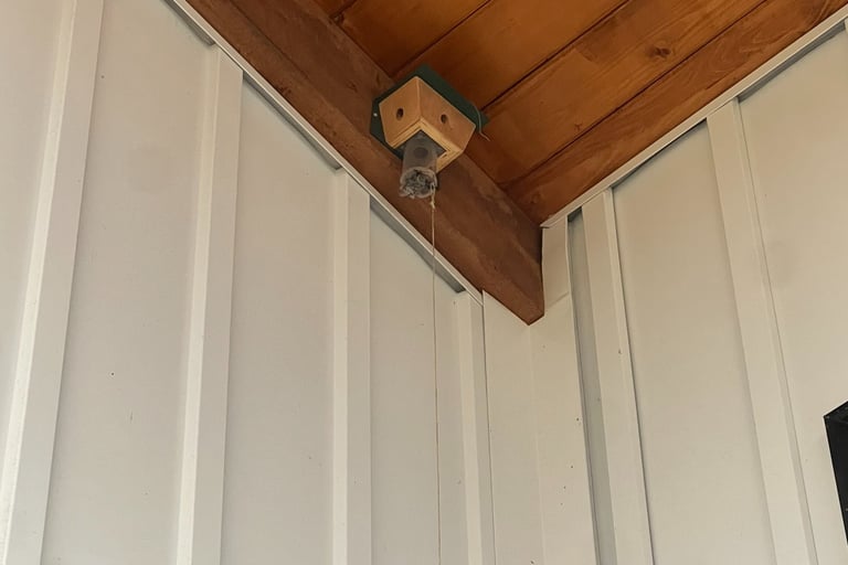 Gentle “Bee-Friendly” Deterrents: I experimented with some gentler, natural deterrents. I hung a fake wasp nest (just a crumpled brown paper bag) under the eaves, since folklore says carpenter bees avoid areas with wasps. I also sprayed a citrus-oil solution around the beams after reading that they dislike strong scents. (One popular tip is using citrus or almond oil; female carpenter bees supposedly avoid wood that smells like citrus or almond. Additionally, I set out a carpenter bee trap – a small wooden box with angled holes leading into an unescapable trap. The idea is that bees enter the holes, then get trapped in the box and die.